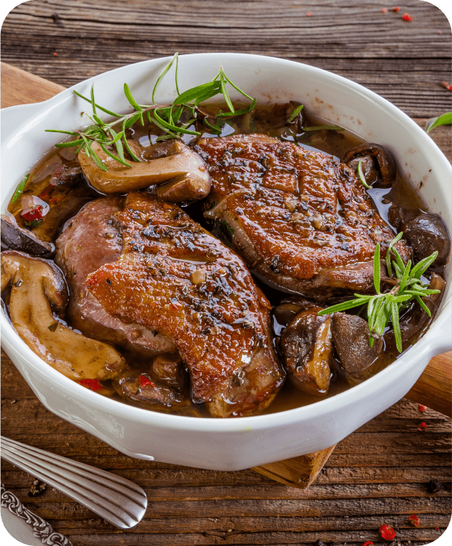 a přidejte houby. Vše pořádně osolte, opepřete a přidejte drcený česnek. Za stálého míchání smažte přibližně 2 minuty. Přilijte půl šálku vody, přidejte nadrobno nakrájená sušená rajčata, máslo, snítku čerstvého rozmarýnu a petrželovou nať. Poduste přibližně 10 minut. Po uplynutí této doby spojte houby s kachními prsy v zapékací nádobě a nádobu odstavte na několik minut,